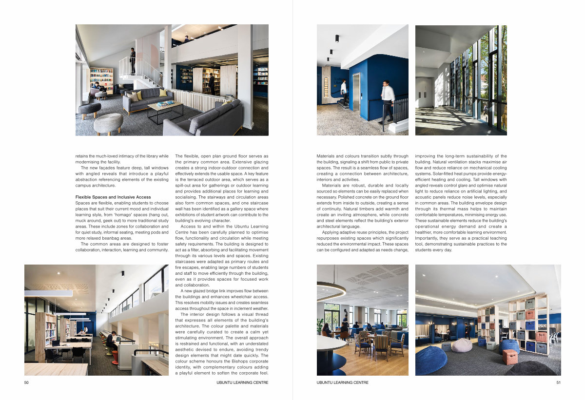 Access to and within the Ubuntu Learning Centre has been carefully planned to optimise flow, functionality and circulation while meeting safety requirements. The building is designed to act as a filter, absorbing and facilitating movement through its various levels and spaces. Existing staircases were adapted as primary routes and fire escapes, enabling large numbers of students and staff to move efficiently through the building, even as it provides spaces for focused work and collaboration.