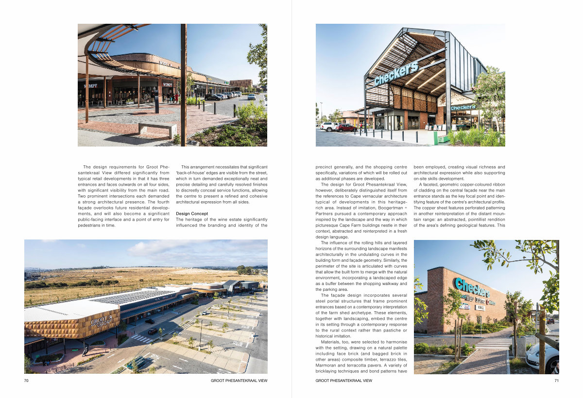 The design requirements for Groot Phesantekraal View differed significantly from typical retail developments in that it has three entrances and faces outwards on all four sides, with significant visibility from the main road. Two prominent intersections each demanded a strong architectural presence. The fourth façade overlooks future residential developments, and will also become a significant public-facing interface and a point of entry for pedestrians in time.