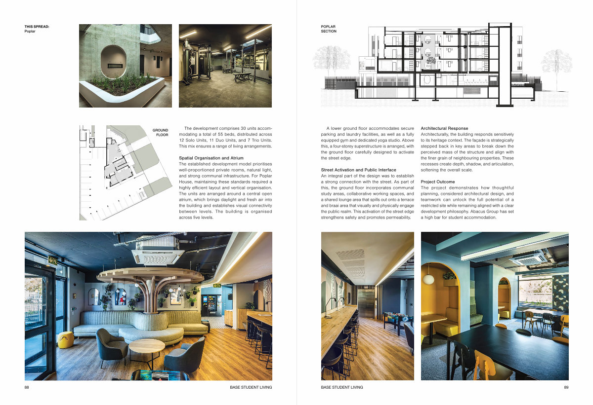Spatial Organisation and Atrium The established development model prioritises well-proportioned private rooms, natural light, and strong communal infrastructure. For Poplar House, maintaining these standards required a highly efficient layout and vertical organisation. The units are arranged around a central open atrium, which brings daylight and fresh air into the building and establishes visual connectivity between levels. The building is organised across five levels.