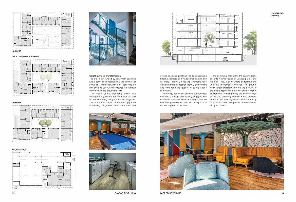 The communal area within the building looks out onto the intersection of Dennesig Street and Hofman Road, a point where pedestrian and vehicular movement converge. The groundfloor layout therefore mirrors the activity of the public realm within a semi-private interior environment. Planting along the western edge of the site, bordering Hofman Road, provides shade to the building while also contributing to a more comfortable pedestrian environment along the street.