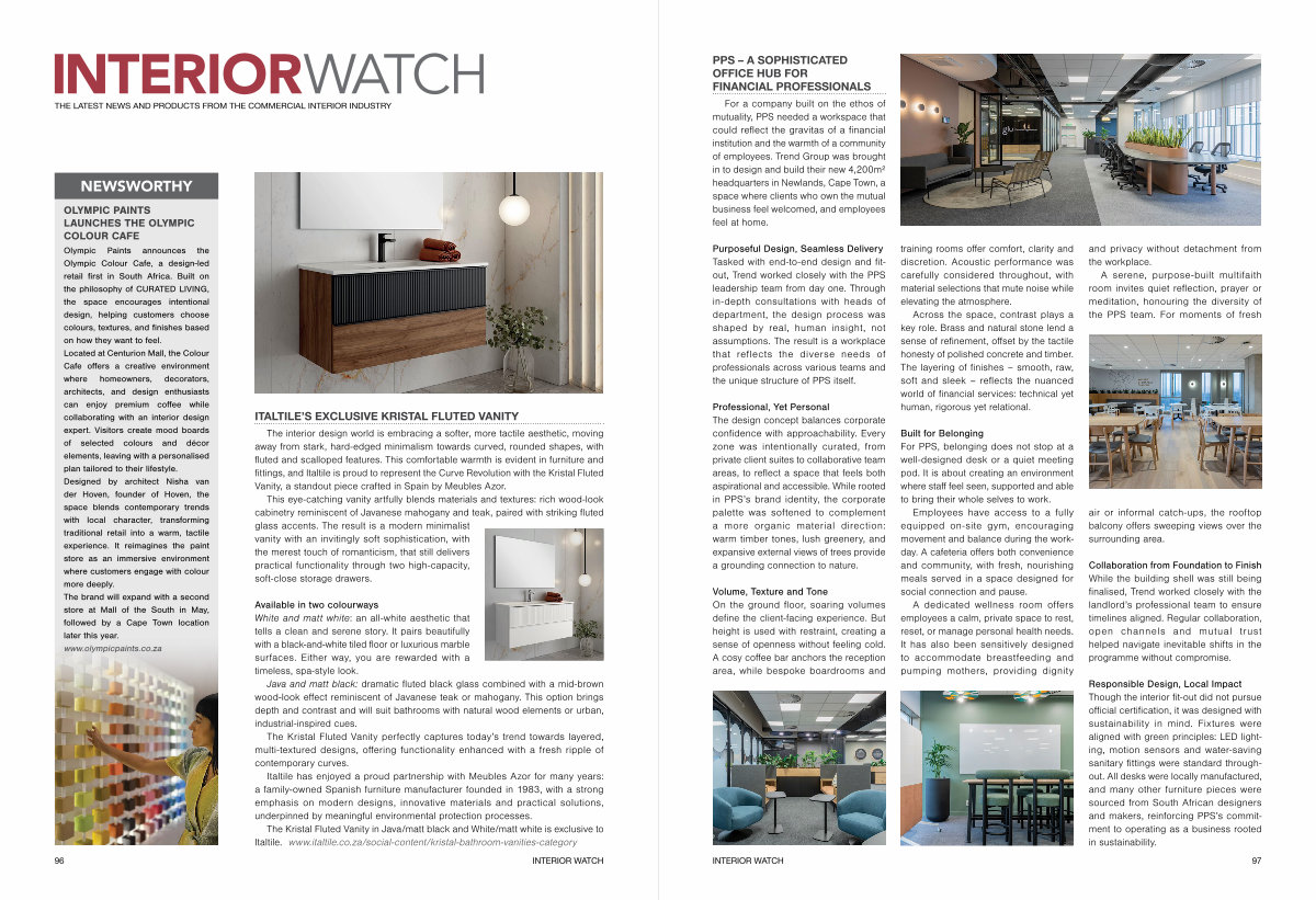 Responsible Design, Local Impact Though the interior fit-out did not pursue official certification, it was designed with sustainability in mind. Fixtures were aligned with green principles: LED lighting, motion sensors and water-saving sanitary fittings were standard throughout. All desks were locally manufactured, and many other furniture pieces were sourced from South African designers and makers, reinforcing PPS’ s commitment to operating as a business rooted in sustainability.