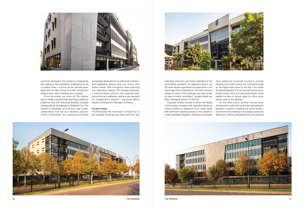 individual character, yet clearly belonged to the same family and fabric. The approach was to use the same façade ingredients but apply them in different ways and combinations. The main entrance design for each of the buildings was kept similar for ease of visitor orientation”, explains Madi van Wyk, managing director of Dot Ink.