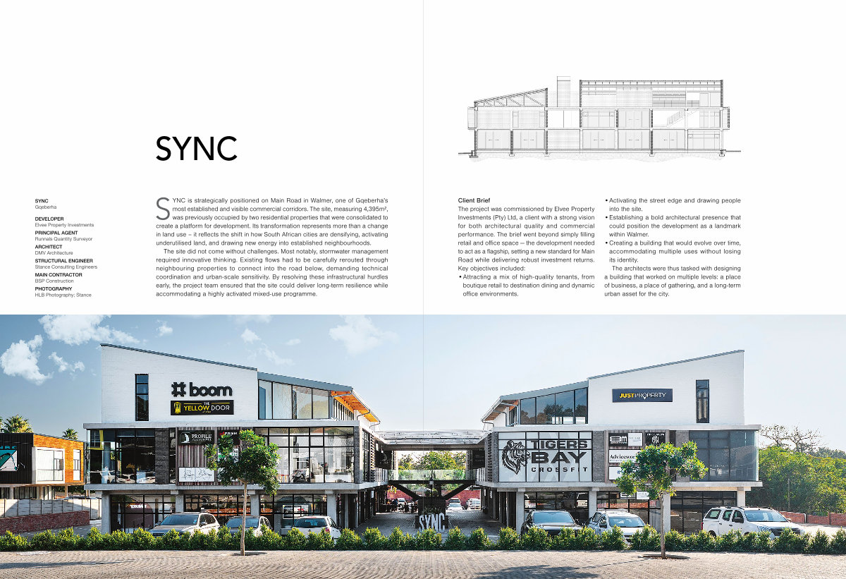 SYNC is strategically positioned on Main Road in Walmer, one of Gqeberha’ s most established and visible commercial corridors. The site, measuring 4,395m ², was previously occupied by two residential properties that were consolidated to create a platform for development. Its transformation represents more than a change in land use – it reflects the shift in how South African cities are densifying, activating underutilised land, and drawing new energy into established neighbourhoods.