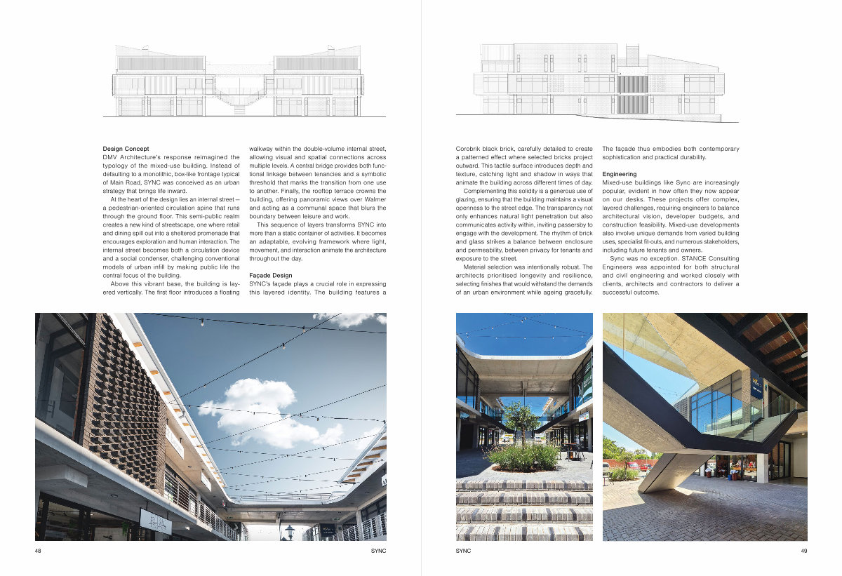 Design Concept DMV Architecture’ s response reimagined the typology of the mixed-use building. Instead of defaulting to a monolithic, box-like frontage typical of Main Road, SYNC was conceived as an urban strategy that brings life inward.