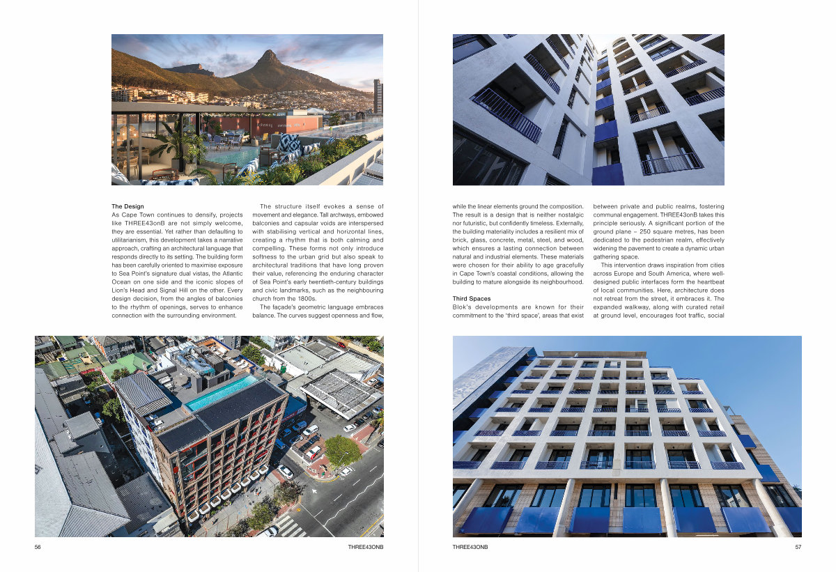 The Design As Cape Town continues to densify, projects like THREE43onB are not simply welcome, they are essential. Yet rather than defaulting to utilitarianism, this development takes a narrative approach, crafting an architectural language that responds directly to its setting. The building form has been carefully oriented to maximise exposure to Sea Point’ s signature dual vistas, the Atlantic Ocean on one side and the iconic slopes of Lion’ s Head and Signal Hill on the other. Every design decision, from the angles of balconies to the rhythm of openings, serves to enhance connection with the surrounding environment.