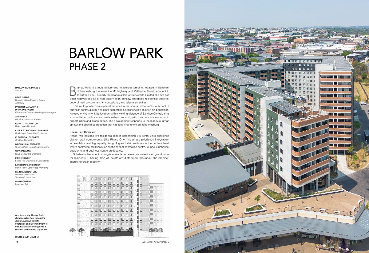 This multi-phase development includes retail shops, restaurants, a school, a business centre, a gym, and other supporting functions within an open-air, pedestrianfocused environment. Its location, within walking distance of Sandton Central, aims to establish an inclusive and sustainable community with direct access to economic opportunities and green space. The development responds to the legacy of urban sprawl and spatial segregation that has long characterised Johannesburg.