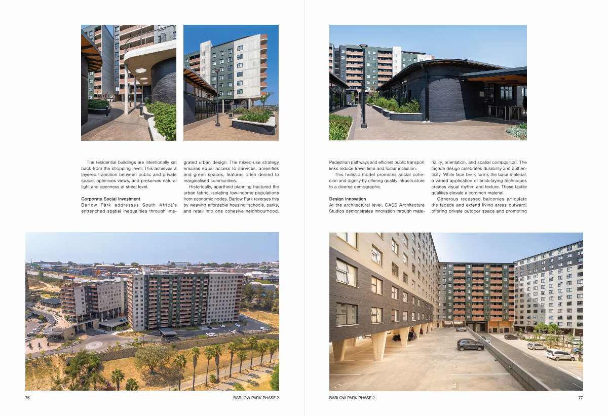Design Innovation At the architectural level, GASS Architecture Studios demonstrates innovation through materiality, orientation, and spatial composition. The façade design celebrates durability and authenticity. While face brick forms the base material, a varied application of brick-laying techniques creates visual rhythm and texture. These tactile qualities elevate a common material.