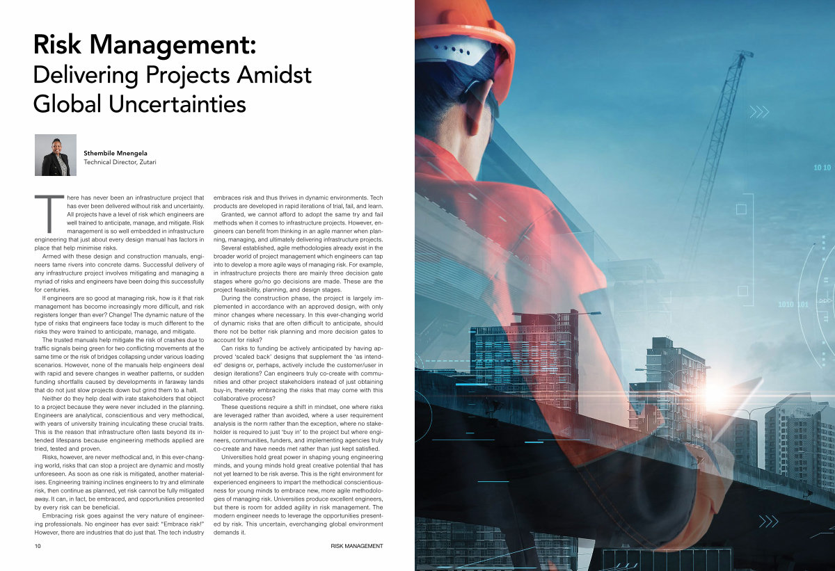 Risks, however, are never methodical and, in this ever-changing world, risks that can stop a project are dynamic and mostly unforeseen. As soon as one risk is mitigated, another materialises. Engineering training inclines engineers to try and eliminate risk, then continue as planned, yet risk cannot be fully mitigated away. It can, in fact, be embraced, and opportunities presented by every risk can be beneficial.
