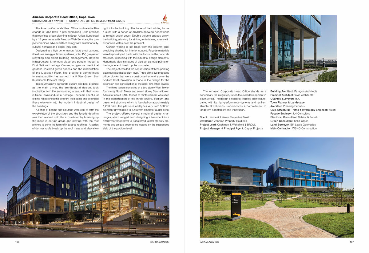 The Amazon Corporate Head Office is situated at Riverlands in Cape Town- a groundbreaking 3.4ha precinct that redefines urban planning in South Africa. Supported by a 15 year lease with Amazon Web Services, the project combines advanced technology with sustainabality, cultural heritage and social inclusion.