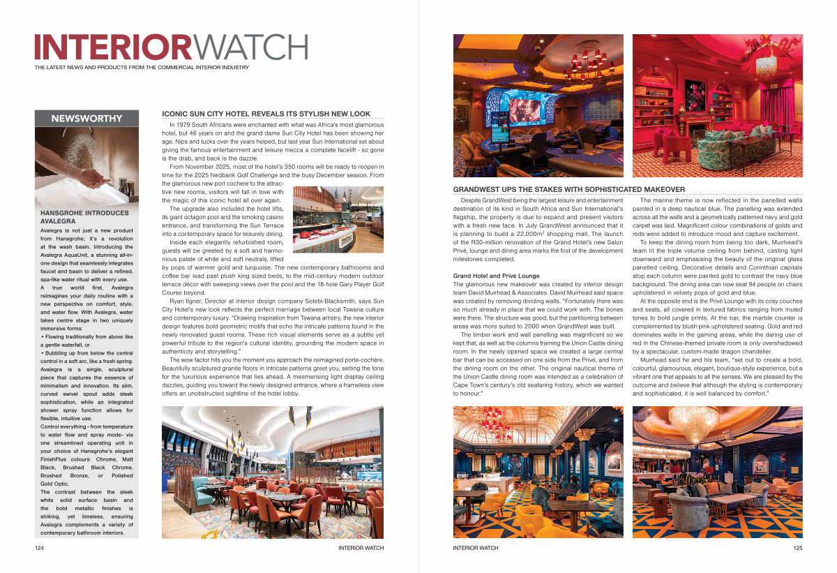 Ryan Ilgner, Director at interior design company Solebi-Blacksmith, says Sun City Hotel’ s new look reflects the perfect marriage between local Tswana culture and contemporary luxury.“ Drawing inspiration from Tswana artistry, the new interior design features bold geometric motifs that echo the intricate patterns found in the newly renovated guest rooms. These rich visual elements serve as a subtle yet powerful tribute to the region’ s cultural identity, grounding the modern space in authenticity and storytelling.”