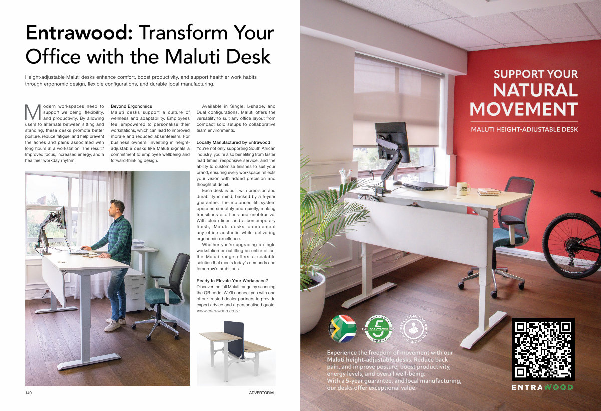 Experience the freedom of movement with our Maluti height-adjustable desks. Reduce back pain, and improve posture, boost productivity, energy levels, and overall well-being. With a 5-year guarantee, and local manufacturing, our desks offer exceptional value.
