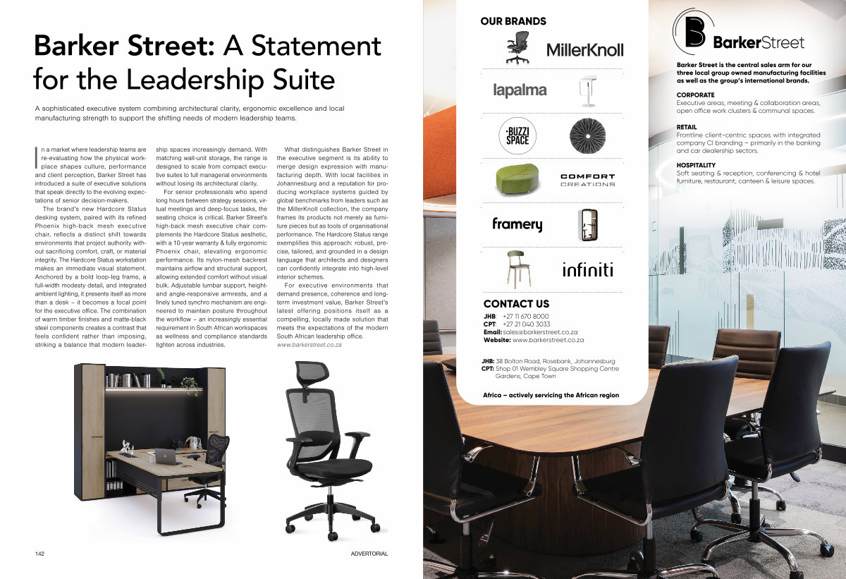 For executive environments that demand presence, coherence and longterm investment value, Barker Street’ s latest offering positions itself as a compelling, locally made solution that meets the expectations of the modern South African leadership office. www. barkerstreet. co. za