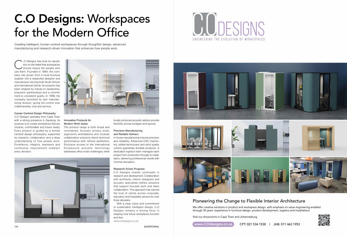 With a clear vision and commitment to sustainable intelligent design, C. O Designs remains a driving force in shaping how future workplaces function and feel. www. codesigns. co. za