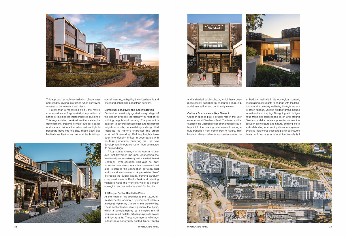 A key spatial strategy is the central crossaxis that traverses the mall, connecting the residential precincts directly with the rehabilitated Liesbeek River corridor. This axis not only promotes seamless pedestrian movement but also reinforces the connection between built and natural environments. A pedestrian‘ lane’ intersects the public piazza, framing carefully composed views of Devil’ s Peak and orienting visitors towards the riverfront, which is a major ecological and recreational asset for the city.