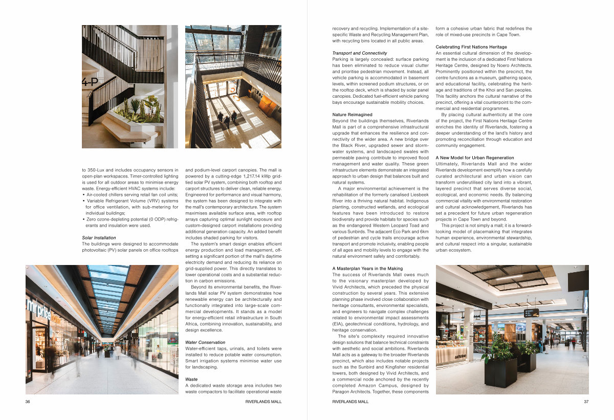 Nature Reimagined Beyond the buildings themselves, Riverlands Mall is part of a comprehensive infrastructural upgrade that enhances the resilience and connectivity of the wider area. A new bridge over the Black River, upgraded sewer and stormwater systems, and landscaped swales with permeable paving contribute to improved flood management and water quality. These green infrastructure elements demonstrate an integrated approach to urban design that balances built and natural systems.