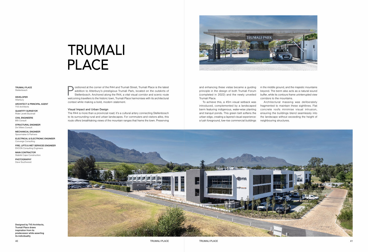 Positioned at the corner of the R44 and Trumali Street, Trumali Place is the latest addition to Atterbury’ s prestigious Trumali Park, located on the outskirts of Stellenbosch. Anchored along the R44, a vital visual corridor and scenic route welcoming travellers to the historic town, Trumali Place harmonises with its architectural context while making a bold, modern statement.