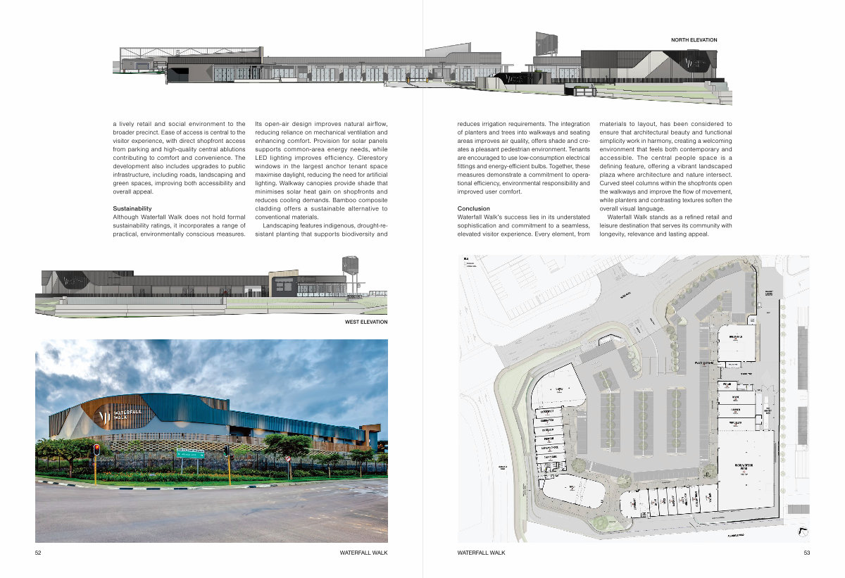Its open-air design improves natural airflow, reducing reliance on mechanical ventilation and enhancing comfort. Provision for solar panels supports common-area energy needs, while LED lighting improves efficiency. Clerestory windows in the largest anchor tenant space maximise daylight, reducing the need for artificial lighting. Walkway canopies provide shade that minimises solar heat gain on shopfronts and reduces cooling demands. Bamboo composite cladding offers a sustainable alternative to conventional materials.