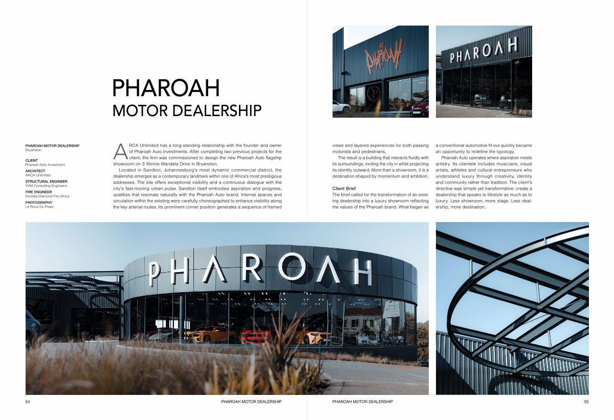 ARCA Unlimited has a long-standing relationship with the founder and owner of Pharoah Auto Investments. After completing two previous projects for the client, the firm was commissioned to design the new Pharoah Auto flagship showroom on 3 Winnie Mandela Drive in Bryanston.