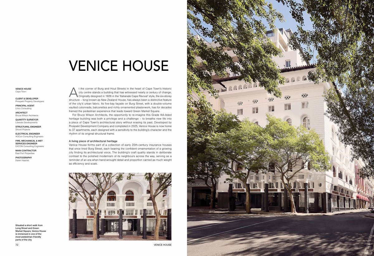 For Bruce Wilson Architects, the opportunity to re-imagine this Grade IIIA-listed heritage building was both a privilege and a challenge – to breathe new life into a piece of Cape Town’ s architectural story without erasing its past. Developed by Prospekt Development Company and completed in 2025, Venice House is now home to 37 apartments, each designed with a sensitivity to the building’ s character and the rhythm of its original structural frame.