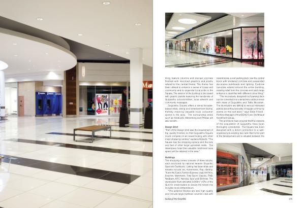 Design Brief “ Part of the design brief was the requirement of top quality finishes so that Gugulethu Square could compete on an equal footing with other major shopping centres ,” explains Roberts . “ The Square has the shopping options and the look and feel of other large upmarket malls . The developers hope that valuable catchment area spend will be retained in the area .” natural stone , a roof parking deck over the central block with shuttered concrete and suspended decorative bulkheads and lighting . Eyebrow canopies extend around the entire building , creating relief from the concrete and each large entrance is identified with different colour tiling .”