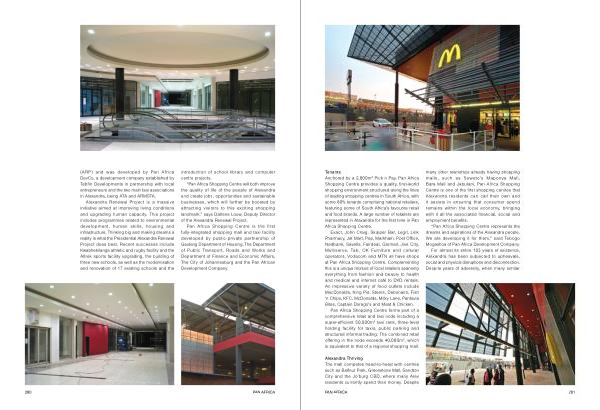 Pan Africa Shopping Centre forms part of a comprehensive retail and taxi node including a super-efficient 50,000m 2 taxi rank , three-level holding facility for taxis , public parking and structured informal trading . The combined retail offering in the node exceeds 40,000m 2 , which is equivalent to that of a regional shopping mall . many other townships already having shopping malls , such as Soweto ’ s Maponya Mall , Bara Mall and Jabulani , Pan Africa Shopping Centre is one of the first shopping centres that Alexandra residents can call their own and it assists in ensuring that consumer spend remains within the local economy , bringing with it all the associated financial , social and employment benefits .