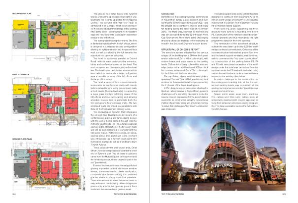 The retail at ground floor is predominantly restaurants facing the open malls with mainly fashion-related tenants facing the enclosed malls at both levels . The top level retail is capped by a large glass rooflight affording views of the loft offices and roof landscaping and allowing abundant natural light to penetrate both the first and ground floor enclosed malls . The two enclosed malls are linked via escalators with three of the five basement parking levels .
