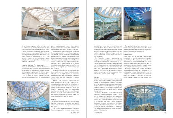 at night from within the centre and viewed externally from Rivonia Road . “ The interior refurbishment included introducing more natural light and internal landscaping with ‘ green ’ touches and the brightening of the parking areas ( close to 1,000 additional parking bays were built ),” says Kanakakis .