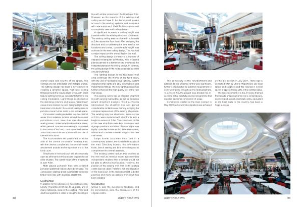 The complexity of the refurbishment and addition to the existing centre was significant . further compounded by Liberty ’ s requirement to continue trading throughout the redevelopment . To achieve this , the project was divided into 41 sections with a carefully planned programme that required sectional completion of areas .