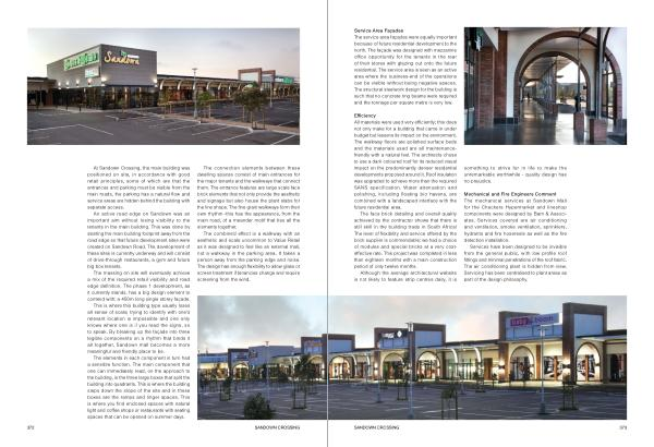 This is where this building type usually loses all sense of scale ; trying to identify with one ’ s relevant location is impossible and one only knows where one is if you read the signs , so to speak . By breaking up the façade into three legible components on a rhythm that binds it all together , Sandown mall becomes a more meaningful and friendly place to be .