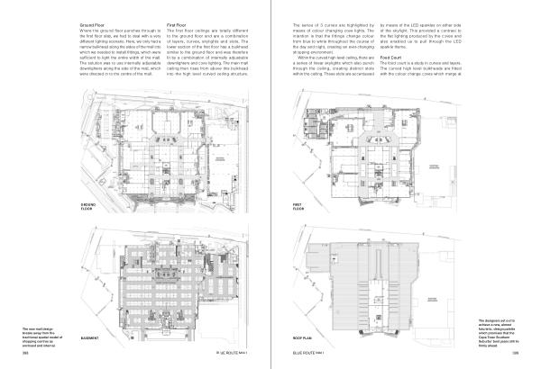 Food Court The food court is a study in curves and layers . The curved high level bulkheads are fitted with the colour change coves which merge at