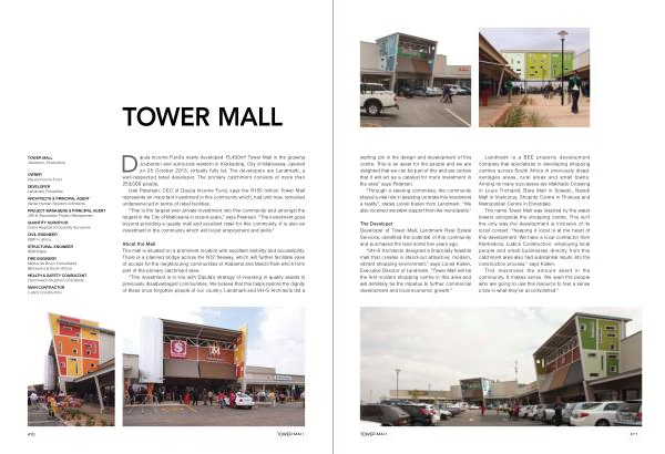 The name Tower Mall was inspired by the water towers alongside the shopping centre . This isn ’ t the only way the development is inclusive of its local context . “ Keeping it local is at the heart of this development . We have a local contractor from Klerksdorp , Ludick Construction , employing local people and small businesses directly from this catchment area also had substantial inputs into the construction process ,” says Kisten .