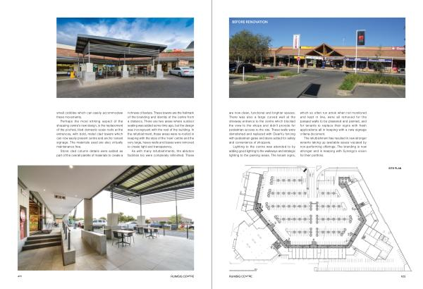 richness of texture . These towers are the hallmark of the branding and identity of the centre from a distance . There are two areas where outdoor seating was added some time ago , but the design was incongruent with the rest of the building . In the refurbishment , these areas were re-roofed in keeping with the style of the ‘ new ’ centre and the very large , heavy walls and bases were removed to create light and transparency .