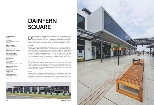 Design Dainfern Square is a neighbourhood shopping centre with a village square atmosphere executed in a very modern aesthetic . The building mass has been broken down to create a varied and rich shopping experience with a decidedly human scale . The building footprint follows a traditional retail model of placing the anchor tenants in the