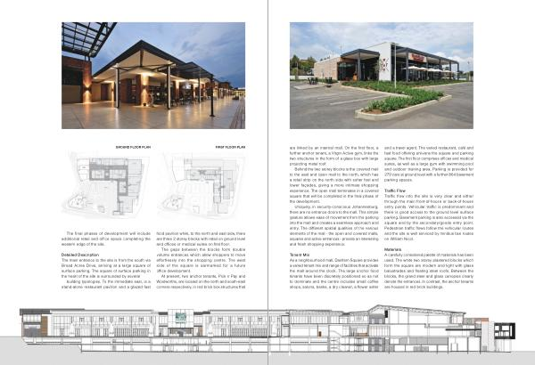 Detailed Description The main entrance to the site is from the south via Broad Acres Drive , arriving at a large square of surface parking . The square of surface parking in the heart of the site is surrounded by several building typologies . To the immediate east , is a stand-alone restaurant pavilion and a glazed fast food pavilion while , to the north and east side , there are three 2 storey blocks with retail on ground level and offices or medical suites on first floor .