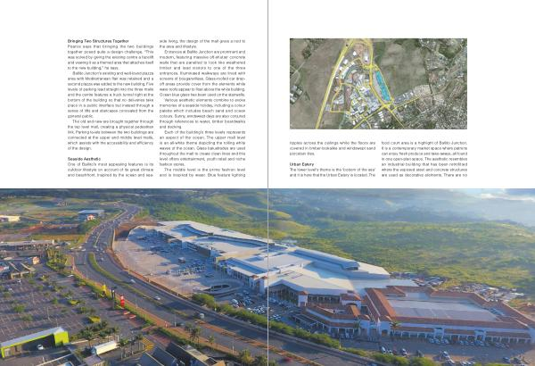Urban Eatery The lower level ’ s theme is the ‘ bottom of the sea ’ and it is here that the Urban Eatery is located . The food court area is a highlight of Ballito Junction . It is a contemporary market space where patrons can enjoy fresh produce and take-aways , all found in one open-plan space . The aesthetic resembles an industrial building that has been retrofitted where the exposed steel and concrete structures are used as decorative elements . There are no