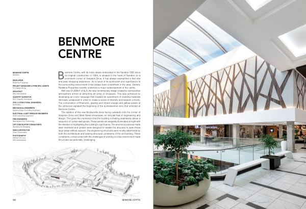 With over 21,000m 2 of GLA , the new contemporary design created a cosmopolitan atmosphere aimed at attracting an array of shoppers . This was achieved by developing an iconic language that boasted an assortment of cladding materials intricately juxtaposed in order to create a sense of diversity and expand curiosity . The combination of Rheinzink , glazing and vibrant orange and yellow panels at the entrances signaled the beginning of the quintessential story that unfolded at Benmore Centre .