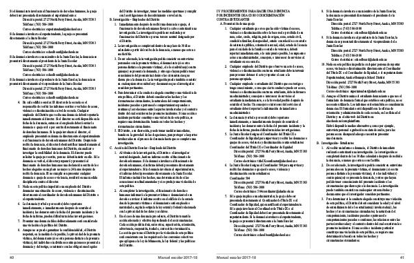6. La denuncia( verbal o por escrito) debe reportarse inmediatamente, o inmediatamente después de ocurrido el incidente; las demoras entre la fecha del presunto incidente y la fecha de informe, pueden dificultar más las investigaciones. 7. Presentar una denuncia falsa deliberadamente será considerado una violación a la política del Distrito.