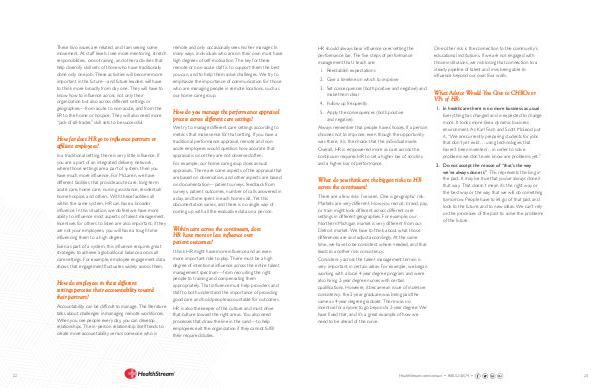 These two issues are related, and I am seeing some movement. At staff levels I see more mentoring, stretch responsibilities, cross-training, and other activities that help diversify skill sets of those who have traditionally done only one job. These activities will become more important in the future— and future leaders will have to think more broadly from day one. They will have to know how to influence across not only their organization but also across different settings or geographies— from acute to non-acute, and from the ER to the home or hospice. They will also need more“ jack-of-all-trades” skill sets to be successful.