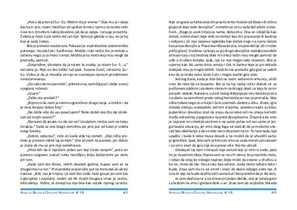 Nije se igrala sa lutkicama niti pravila torte i kolače od blata niti slične gluposti koje rade devojčice“, osmehnuo se tu sada dečačkim osmehom. „ Nego je uvek trčala za nama, dečacima. Ona se i oblačila kao dečak, volela stvari koje vole svi dečaci kao što je pecanje ili kauboji i indijanci, ali nije zapravo izgledala kao dečak nego na njenu žalost kao prava devojčica. Plava kovrdžava kosica, krupne dečije oči i nežan ptičiji glasić. Osobine na kojoj su joj druge devojčice svakako zavidele ali koje njoj u toj životnoj dobi ni na koji način nisu mogle pomoći da uđe u društvo dečaka. Ipak, nje se nije moglo lako otarasiti. Bila je uporna kao što samo deca umeju i čak ni batine koje je po nekada dobijala nisu je mogle odbiti. Uvek bi nas pronašla gde god se sakrili kao da je imala neko šesto čulo i mogla osetiti gde smo.