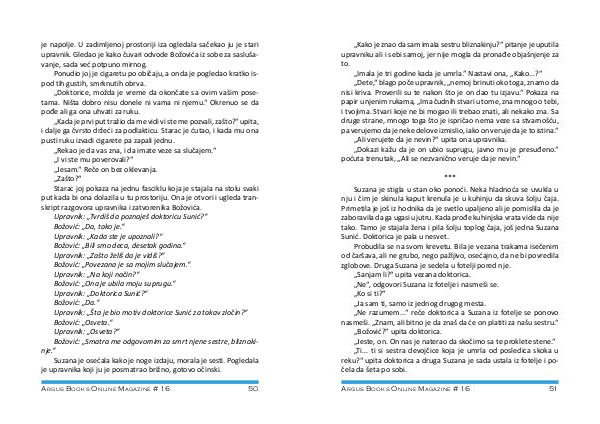 Probudila se na svom krevetu. Bila je vezana trakama isečenim od čaršava, ali ne grubo, nego pažljivo, osećajno, da ne bi povredila zglobove. Druga Suzana je sedela u fotelji pored nje. „ Sanjam li?“ upita vezana doktorica. „ Ne“, odgovori Suzana iz fotelje i nasmeši se. „ Ko si ti?“ „ Ja sam ti, samo iz jednog drugog mesta. „ Ne razumem...“ reče doktorica a Suzana iz fotelje se ponovo nasmeši. „ Znam, ali bitno je da znaš da će on platiti za našu sestru.“ „ Božović?“ upita doktorica. „ Jeste, on. On nas je naterao da skočimo sa te proklete stene.“ „ Ti... ti si sestra devojčice koja je umrla od posledica skoka u reku?“ upita doktorica a druga Suzana je sada ustala iz fotelje i počela da šeta po sobi.