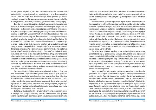 Sad, empirijski doživljaj o njemu podjednak je kao o ženi koja nam internetom šalje sliku svoje sjene na zidu. Svašta! Ipak, potpuno odbacivanje objekata postuliranih mimo svakog ljudskog iskustva, donekle bijaše ublaženo mojim numeraničnim karakterom. Zašto sedam dodatnih, odnosno ukupno jedanaest dimenzija svemira? Izgleda da je i u toj teoriji, kao izvučenoj iz konjske grive, vrijeme jedinstveno za nas i za vasione izlegle iz mašte kozmologa, koje moju ostavljaju da nedostižno kaska iza njih.