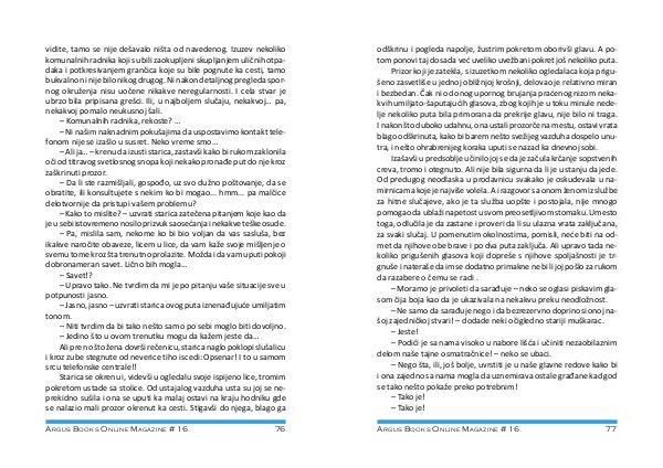 – Pa, mislila sam, nekome ko bi bio voljan da vas sasluša, bez ikakve naročite obaveze, licem u lice, da vam kaže svoje mišljenje o svemu tome kroz šta trenutno prolazite. Možda i da vam uputi pokoji dobronameran savet. Lično bih mogla … – Savet!? – Upravo tako. Ne tvrdim da mi je po pitanju vaše situacije sve u potpunosti jasno. – Jasno, jasno – uzvrati starica ovog puta iznenađujuće umiljatim tonom. – Niti tvrdim da bi tako nešto samo po sebi moglo biti dovoljno. – Jedino što u ovom trenutku mogu da kažem jeste da … Ali pre no što žena dovrši rečenicu, starica naglo poklopi slušalicu i kroz zube stegnute od neverice tiho iscedi: Opsenar! I to u samom srcu telefonske centrale!!