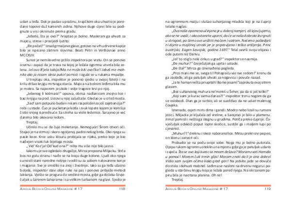 „ Ova naša opomena učinjena je u dobroj namjeri, ali izjavljujemo, ako se ne uvaži, i ako ostanete uporni, da će se naša dobrota izvrgnuti u strogost, pa ćemo sve uništiti mačem i vatrom. Nećemo poštedjeti ni dijete u majčinoj utrobi jer je pripravljena i teška artiljerija. Princ austrijski, Eugen Savojski, godina 1697.“ Telal završi svoju objavu i ode putem niz Darivu. „ Jel’ to stig’ o neki cirkus u grad?“ inspektor se nasmija. „ Đe muhur?“ čovječuljak ga upita i ustade. „ Đe šta?“ Mirza ga iznenađeno pogleda. „ Prco mani me se, svega ti! Pohapsiću vas sve redom!“ krenu da ga zaobiđe, ali ga patuljak uhvati za nogavicu i povuče nazad. „ Ja te haman nešta priupitah! Bome jesam!“ zapiskuta ovaj sitnim glasom. „ Bez sultanovog muhura ne’ mereš u Šeher, pa da si još toliki!“ „ Koji vam je kurac svima danas?!“ inspektor trznu nogom da ga se oslobodi. Dlan ga je svrbio, ali se suzdržao da ne udari malenog čovjeka.
