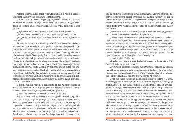 „ Polako, malo je reskija, ja zaboravih da opomenem“ kiskao se Strahinja, teatralno mlatarajući krpama koje su se nalazile na mestu rukava. I sam se zakašljao i počeo smejati uporedo. „ Oštra!“ nadovezao se Mastilo, takođe smejući se. Seli su na eho nekadašnjeg travnjaka, jedan kraj drugog. Mastilo nije bio siguran je li u pitanju bila prava ili prividna spontanost. Predugo je vešto manipulisao ljudima da bi takvu finesu mogao sa sigurnošću da notira. Svojom harizmom je vladao suvereno, nikada se ne pitavši šta je to u glavi njegove žrtve. Strahinja je, očito, bio idealan plen, tačno onakav kakvog je čekao i vrebao od početka. Razdragan, duhovit, neoprezan. Bez brige i pameti. Jedan od onih