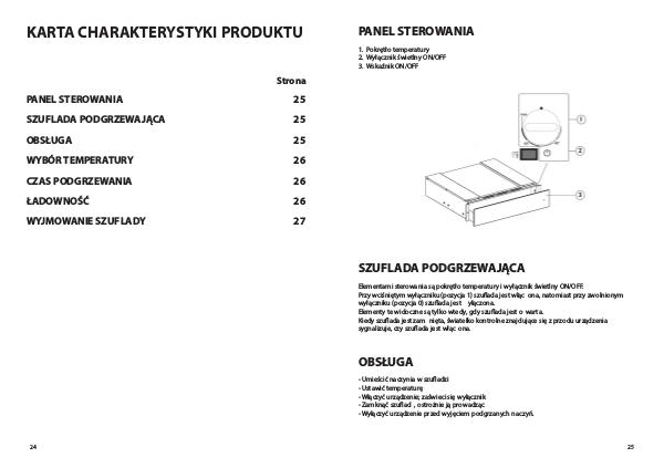 KARTA CHARAKTERYSTYKI PRODUKTU Strona PANEL STEROWANIA 25 SZUFLADA PODGRZEWAJĄCA 25 OBSŁUGA 25 WYBÓR TEMPERATURY 26 CZAS PODGRZEWANIA 26 ŁADOWNOŚĆ 26 WYJMOWANIE SZUFLADY 24 27