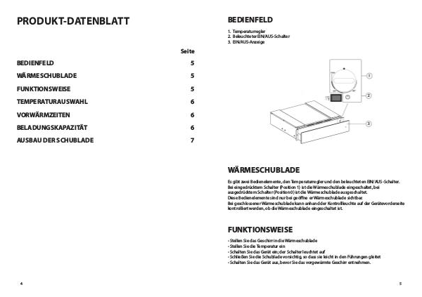 PRODUKT-DATENBLATT Seite BEDIENFELD 5 WÄRMESCHUBLADE 5 FUNKTIONSWEISE 5 TEMPERATURAUSWAHL 6 VORWÄRMZEITEN 6 BELADUNGSKAPAZITÄT 6 AUSBAU DER SCHUBLADE 4 7