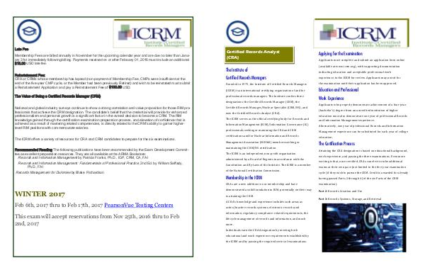 information, regulatory compliance-related requirements, the lifecycle management of records and information, and much more. Individuals earn the CRA designation by meeting both educational and work experience requirements established by the ICRM and by passing the required series of examinations.