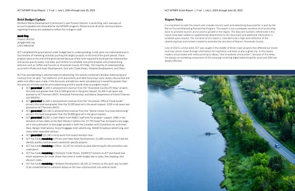 ACT completed the grant period under budget due to underspending. Funds were not reallocated due to the timeline of marketing activities pushing the largest projects to the end of the grant period. These projects were at the end of the grant period because of the time required to build partner relationships and secure quality assets, trail data, and content to complete new print projects and programming activities such as Coffee and Tourism or Aroostook County ATV Map. The majority of underspending occurred in Photo and Asset Development, Domestic Trade Shows, Website Development, and Other,