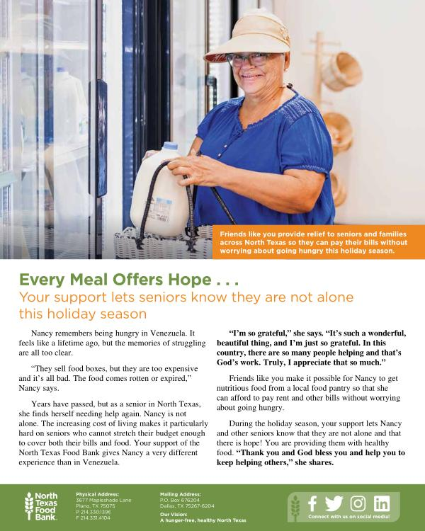 Years have passed, but as a senior in North Texas, she finds herself needing help again. Nancy is not alone. The increasing cost of living makes it particularly hard on seniors who cannot stretch their budget enough to cover both their bills and food. Your support of the North Texas Food Bank gives Nancy a very different experience than in Venezuela.