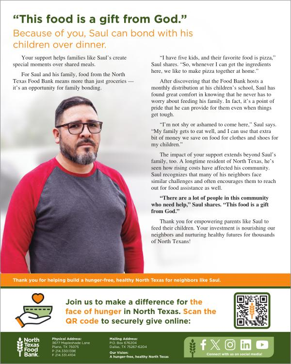 The impact of your support extends beyond Saul ’ s family , too . A longtime resident of North Texas , he ’ s seen how rising costs have affected his community . Saul recognizes that many of his neighbors face similar challenges and often encourages them to reach out for food assistance as well .